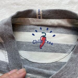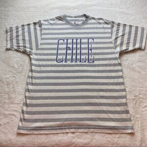 Chile Tees Gray White Striped Short Sleeve Tee Size Large. Great used condition. Front Chile Graphic with a tiny penguin. Measures chest 41”, length 27.5”, sleeve 9”.