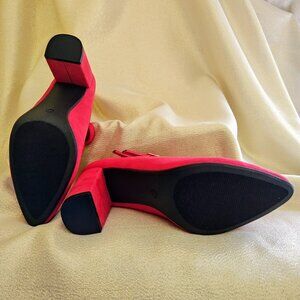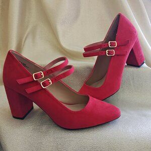Women's 8.5M Comfort brand Chili Pepper (style name) red suede Mary Janes with double adjustable straps. This never worn shoe has a 3.25" block heel.