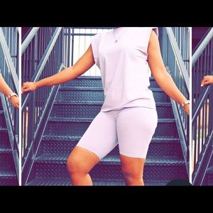 Sleeveless, padded shoulder top with biker shorts