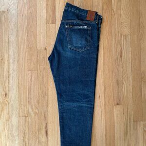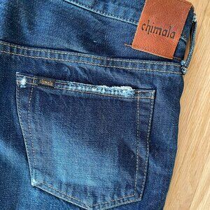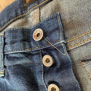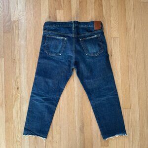 Dark blue wash denim with 5 pockets. Raw-edge trim and distressed accents. Button closure. Made in Japan.