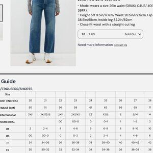 Height 5ft 9.5in/177cm, Waist 28.5in/72.5cm, Hip 38.5in/98cm, Inside leg 32.2in/82cm
