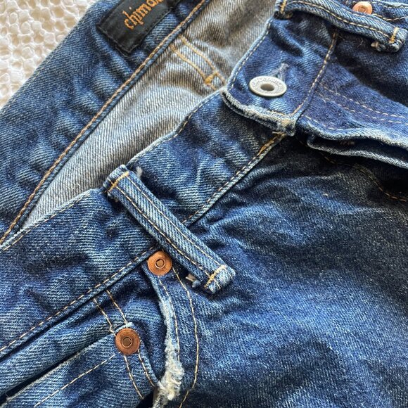 Women's vintage straight cut jeans from Chimala in 13.5 oz selvedge denim. Mid-rise, relaxed fit, straight cut with button fly and classic 5-pocket design. Premium Japanese Cotton selvedge denim features hand distressing throughout.