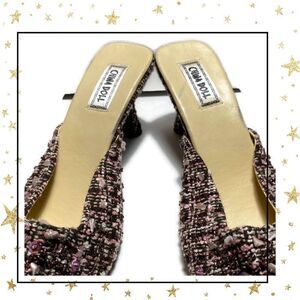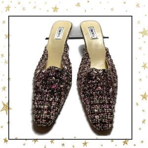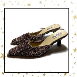 Cute! pair of China Doll women's brown and pink tweed, sequin, slide, heeled mules. Heel: 3"