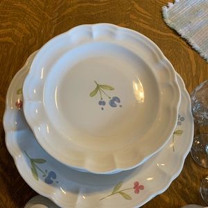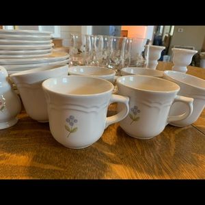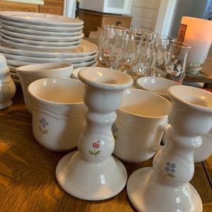6 large dinner plates, 6 small plates, 6 mugs, 6 glasses, salt and pepper shaker, and 2 candle holders