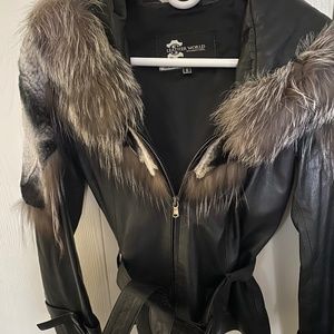 Stylish black leather jacket with beautiful fur trim. Never worn. Medium but runs small