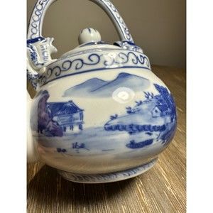 This beautiful, unique Chinese porcelain teapot has an underglaze cobalt blue painting of a river landscape and village scene, with people on small boats, small houses, a person on a bridge, trees, birds in the sky, and mountains in the background. There is a sculpted water dragon lizard on each side of the handle.