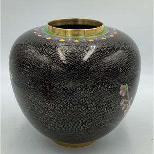 Black Chines Cloisonné vase/jar with a gold and a colorful design on rim and a floral pattern featuring cherry blossom flowers, flower buds and a red bird. Made in the People’s Republic of China. Pre-owned, good condition.