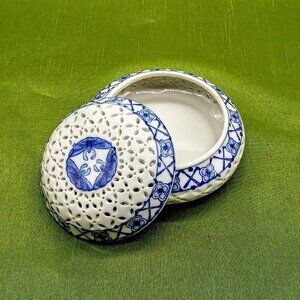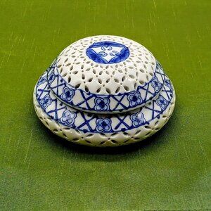 Pretty Chinese blue and white porcelain covered round box with reticulated sides and lid.