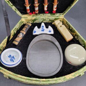 Chinese Calligraphy Box Set Brushes Ink Stick Porcelain Holder Chop DH873