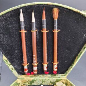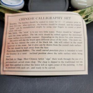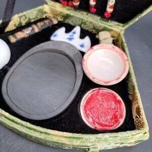 This exquisite Chinese Calligraphy Set comes with brushes, an ink stick, and a porcelain holder. Red ink and a chop are included, all packaged in a decorative green fabric box.