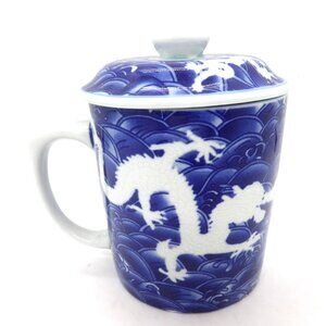 Branded Porcelain Chinese Tea Mug with Matching Lid, Dragon Design White and Blue 3.5in. Tall by 3.25in. Wide from collection never used.