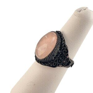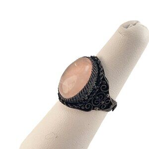 This antique Chinese export ring, dating from 1890 to 1920, features a rose quartz cabochon oval set in intricate filigree. The ring is adjustable to fit size 7 and made from coin silver and copper, with a black, grey, and pink purple color palette.
