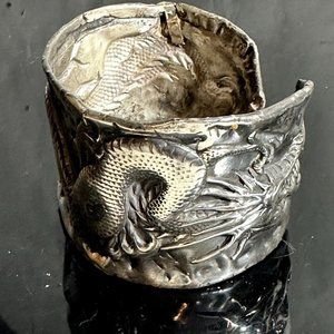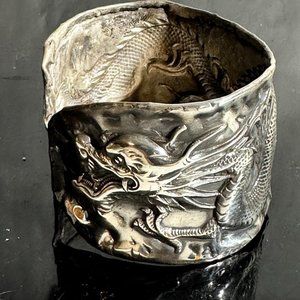 Chinese Four Toed Dragon Wang Hing Sterling Silver Cuff Bracelet Rare Antique