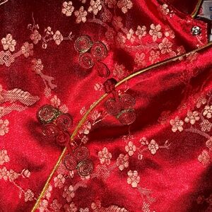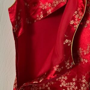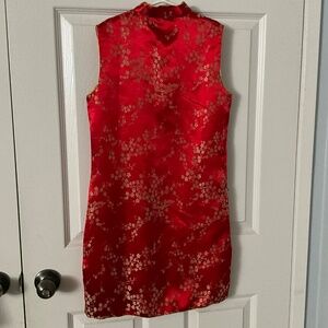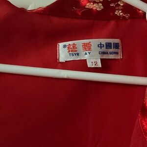 Chinese Gown (Cheongsam or Qipao) Kids Asian 12. Excellent condition. Red with gold pattern. Side slits on both sides. Zipper and button closure.