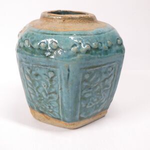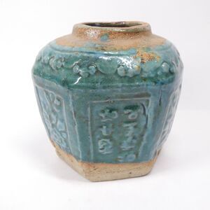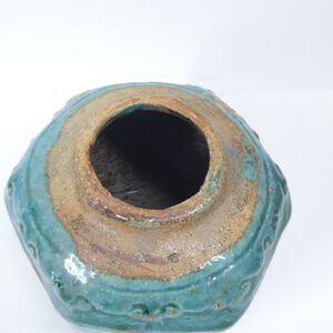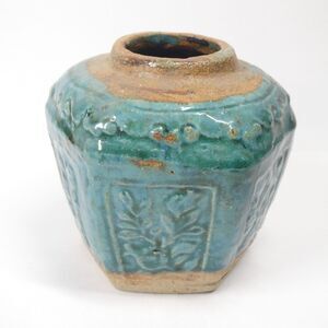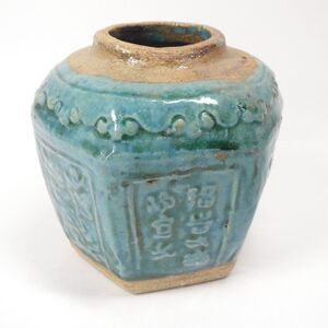 Antique Chinese ginger jar. Earthenware with blue-green drip glaze. Measures about 5 inches tall. Shows some overall wear, and glazing/production inconsistencies. Also a thin crack extending downward from the opening. Still displays well!