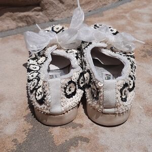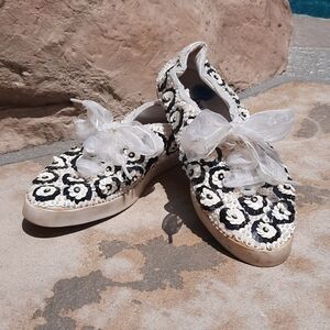 Chinese Laundry size 7.5 vintage white and black floral sequin sneakers shoes. Very good pre-owned condition, some yellowing as shown in pictures where sequins meet shoe base. Smoke free pet friendly home. Sneakers shoes sequin black white floral 7.5 Chinese Laundry