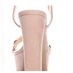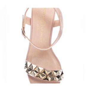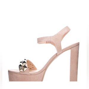 Elevate your party look in the glamorous Chinese Laundry Arnette platform heels featuring a dazzling pyramid studded strap. Synthetic fine suede upper. Synthetic lining and removable footbed. Adjustable ankle strap with buckle closure. Dazzling toe strap with pyramid studs. Round toe construction. Platform sandals with high block heels. Synthetic outsole.