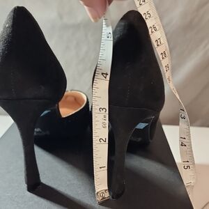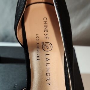 These sophisticated black heels from Chinese Laundry feature a sleek pointed toe design and a medium to high heel height, perfect for professional and formal occasions. The soft suede-like finish and subtle brogue-style detailing near the toe add a touch of elegance. The warm nude insole provides a comfortable contrast to the classic black exterior. #78