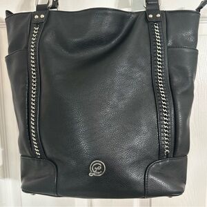 Chinese Laundry Double Handle Black Tote Bucket Bag with Silver Chain Detail
