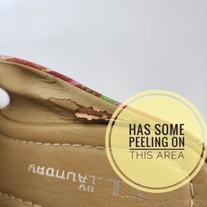 There is a small area where there is peeling but it does not take away from the integrity of the shoe. Cannot be seen when worn.