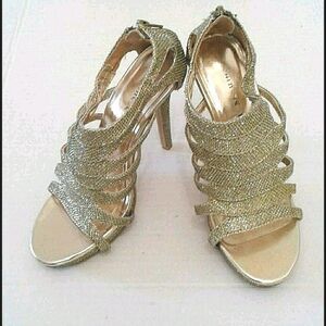 Gold sparkly open toe strappy platform heels. Back zipper for easy on and off. Non leather material.