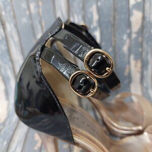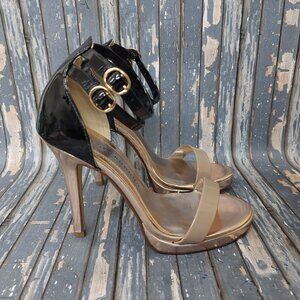 Sexy Chinese Laundry Imagination Strappy High Stiletto Heels Shoes US 6 M Gold Paten Black & Tan Open Toe in Excellent Condition with Original Box