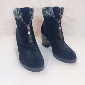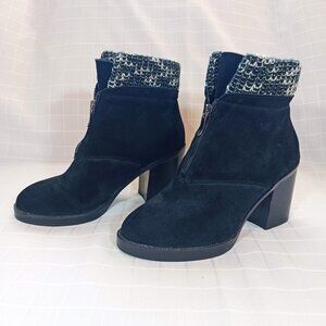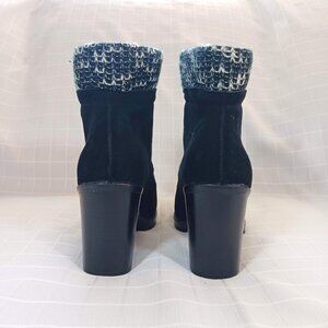 Chinese Laundry "Marvel" black suede ankle boots with black & white knit sweater cuff and front zipper. Chunky 3" heel.