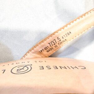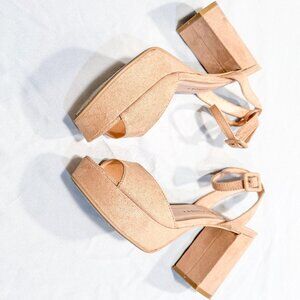 A beautiful tall block heel and chunky rocker platform provide a delightfully retro foundation for a d'Orsay-profile sandal designed with a slim wraparound ankle strap. Perfect nude heel for any occasion! Only worn once. From my personal closet. Excellent pre-loved condition. Some wear on soles of shoes.