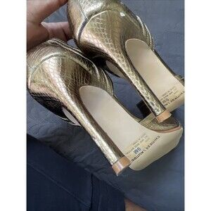 The Chinese Laundry VEDA Pointed Toe T-Strap Bronze Gold Snakeskin Pumps in size 9M are a glamorous and stylish choice for women looking for a metallic and princess-like look. With an ultra-high heel and pointed toe shape, these pumps exude elegance and sophistication. The synthetic upper material and buckle closure add a touch of luxury, making them perfect for a night out or special occasion. The gold color and snake skin pattern give these pumps a chic and sexy vibe, sure to turn heads and elevate any outfit.