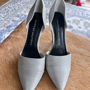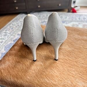 Chinese Laundry size 8 heels. White with grey polka dots. Grippy rubberized bottom for comfort and traction.