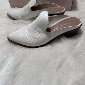 These Chinese Laundry mules feature a sleek white design with a sophisticated textured croc pattern. The slip-on style and low heel make them both stylish and comfortable for any occasion. Their minimalist aesthetic ensures a modern and chic look. Worn but in good condition.