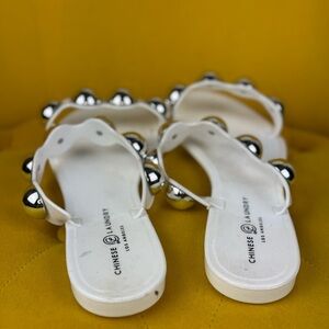 Elevate your style with these sleek sandals from Chinese Laundry, featuring a minimalist design with striking silver studs. The white base provides a clean backdrop for the metallic embellishments, making them a standout choice for any occasion. With a comfortable flat sole, these sandals are perfect for both casual and dressy outings in good condition.