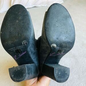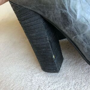 Thick stacked chunky wooden heel w/ light wear marks and one dent/chip as seen in pic.