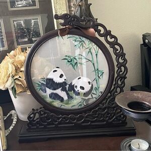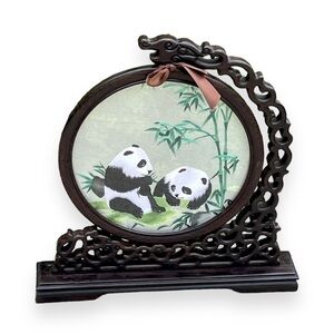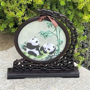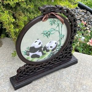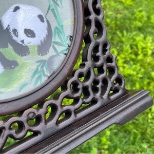 Chinese Panda Suzhou Table Silk Embroidery Double Sided Wooden Screen