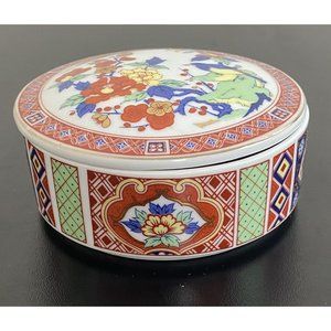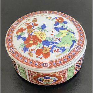 Chinese Porcelain Round Trinket or jewelry box with bird and flowers Lidded.