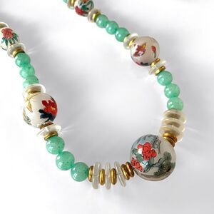 Mouth blown glass reverse painted Chinese beads with a floral motif, gold washed accents and spheres of polished aventurine. 22” length. Set includes matching earrings with a 1 1/4” drop.