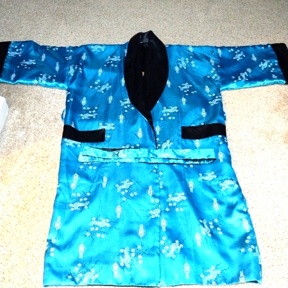 Reversible silky robe, lt. blue with black trim, dragon embroidery inside.