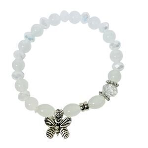 Introducing a Chinese style double bracelet featuring glass beads in white and blue tones, accented with elegant metal butterfly charms. Item is new.