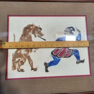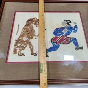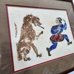 Chinese Temple stone rubbing Framed Art Lion chasing man. The Chinese Ancient tradition is done by carving the image in stone and then pounding the paper onto the image to create a raised image and then Rubbing the image with art medium such as paint or others to create the image. Beautiful piece of Artwork. Estate item described as Vintage from the 80's.