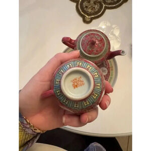 Beautiful and hard to find these days Famille Rose vintage Chinese enamel tea set with teapot, serving plate, and four tea cups.