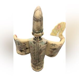 A cast resin figure depicting a standing Chinese courtier with his arms spread - singing in a courtly performance. He is holding a fan in his right hand - dressed in robes painted with black pink and green inks resembling elaborate embroidery of flower designs and fan shapes. He wears a tall ceremonial hat and the long folds of his sleeves are shown with great naturalism. The black incising appears quite intricate and refined. The figure is likely datable to the mid Twentieth Century. Fan and hand is a mobile piece that can be removed