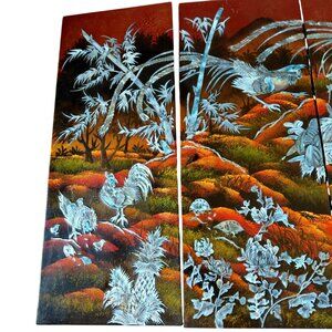 Chinese lacquered panels rooster pheasant bamboo mother of pearl inlay