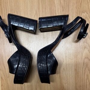 Chic black platform sandals with croc texture. Features adjustable ankle strap. Ideal for stylish outings. Chinese laundry