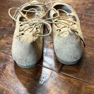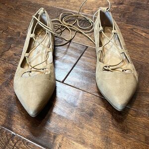 100% Micro Suede Imported Synthetic sole Lace-up ballet flat with pointed toe featuring ankle wrap and textured sole.