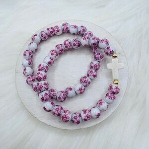Chinese-Style Ceramic Floral Beaded Stretch Bracelet Pink floral Duo with Cross