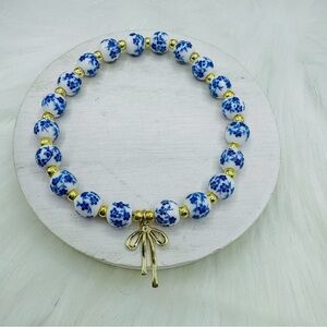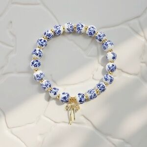 Chinese-Style Ceramic Floral Beaded Stretch Bracelet w/ Bow Charm
