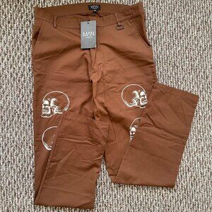 Chino Skull Print Pants Relaxed Fixed Waist, Size 30, Chocolate