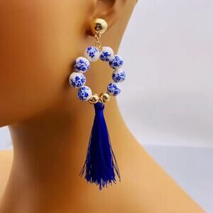 Chinoiserie Beaded Blue and White Tassel Earrings