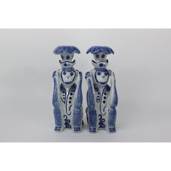 Chinoiserie Monkey Candlestick Holders, White Delft Style Pair