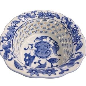 Chinoiserie Porcelain Pierced Oval Bowl Blue and White Blueberry Fruit Design